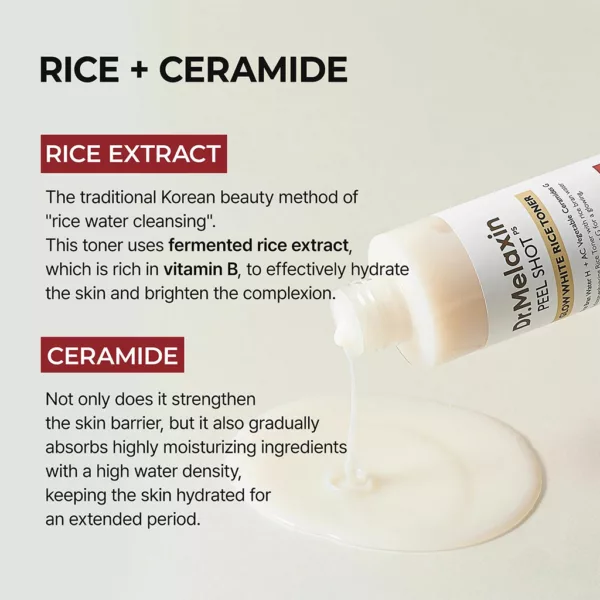 این محصول یک تونر درمانی–مراقبتی است که با الهام از روتینهای سنتی مراقبت از پوست آسیای شرقی و ترکیب آن با فناوری مدرن طراحی شده است. تونر برنج دکتر ملاکسین حاوی عصاره برنج سفید، سرامیدهای گیاهی و ترکیبات آبرسان است که به بازسازی و تقویت پوست کمک میکنند.