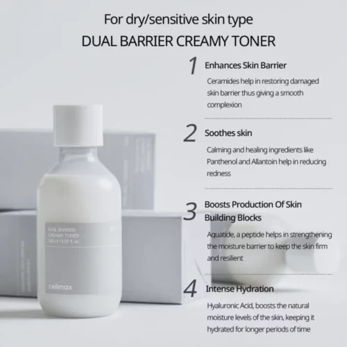 - این تونر به طور خاص برای پوستهای خشک و حساس فرموله شده است و به سلامت سد دفاعی پوست کمک میکند.