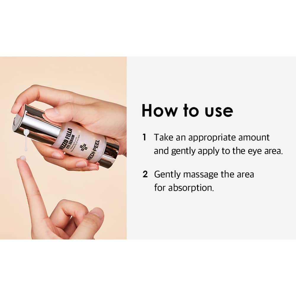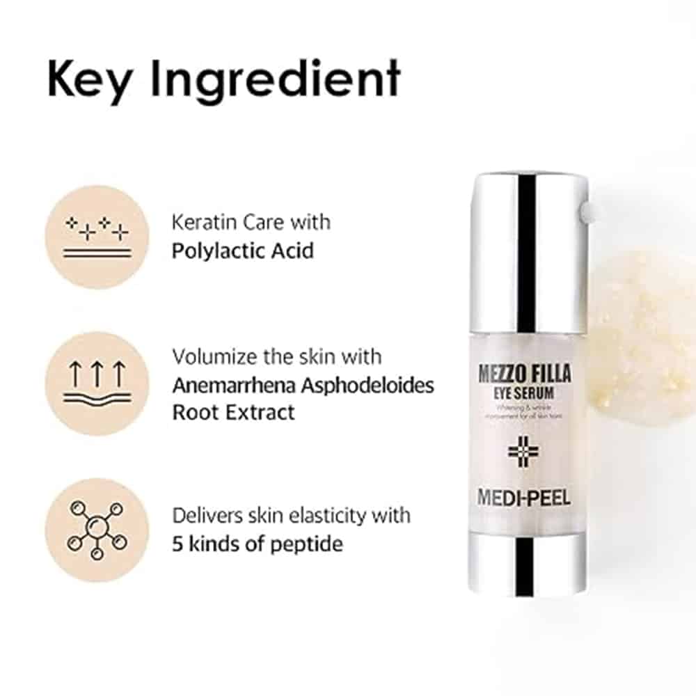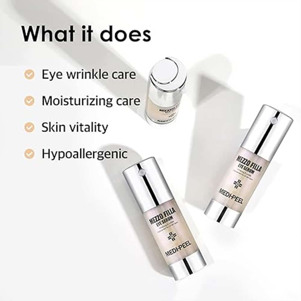 سرم دور چشم Medi peel Mezzo Filla Eye یک سرم جوان کننده چشم است که دارای اثر لیفتینگ شدید است، خطوط بیان اطراف چشم، چینهای میانی اخم و نازولبیال را صاف میکند، دارای اثر جوانسازی، تحریک، آبرسانی عمیق و روشنکننده سیاهی دور چشم است. این سرم برای مراقبت از پوست نازک و حساس ناحیه چشم مناسب است. خاصیت ارتجاعی را افزایش می دهد، پوست را سفت و حجیم می کند، عمق چین و چروک را کاهش می دهد و چین های پوست را صاف می کند. رطوبت از دست رفته را جبران می کند، خشکی و سفتی را از بین می برد، پوست را تغذیه و مرطوب می کند.