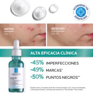 سرم ضد جوش افکلار لاروش پوزای یک سرم فوق العاده غلیظ با عملکرد سه گانه ضد جوش و ضد پیری می باشد که باعث تجدید، اصلاح و روشن شدن منافذ پوست صورت می شود. عملکرد اصلی سرم ضدجوش افکلار لاروش پوزای آبرسانی پوست صورت است و به پوست صورت شما کمک می کند تا چین و چروک و سایر علائم پیری را از بین ببرد. همچنین منافذ پوست را پاکسازی می کند تا از بروز عیوب مانند جوش یا آکنه روی پوست صورت جلوگیری کند.