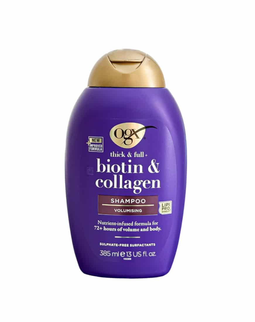شامپو بیوتین و کلاژن او جی ایکس (شامپو بنفش ogx)، یک شامپو مو تخصصی و حرفهای خارجی برای ضخامت بخشیدن به موهای نازک و کم حجم است که با ترکیبات فعال خود، قادر است ساختمان تارهای مو را نیز ترمیم نماید. مکملهای کلاژن و بیوتین در این شامپوی محبوب، بطور موثری در درمان موهای خشک و شکننده یا آسیب دیده، موفق خواهند بود. آبرسانی و ترمیم ساختار مو از مراقبتهای رایج برای داشتن موهایی سالم و زیبا است که اکنون او جی ایکس OGX با شامپو بیوتین و کلاژن خود، شما را در تحقق یافتن آن یاری خواهد کرد. این شامپو بدون سولفات نیز می باشد.