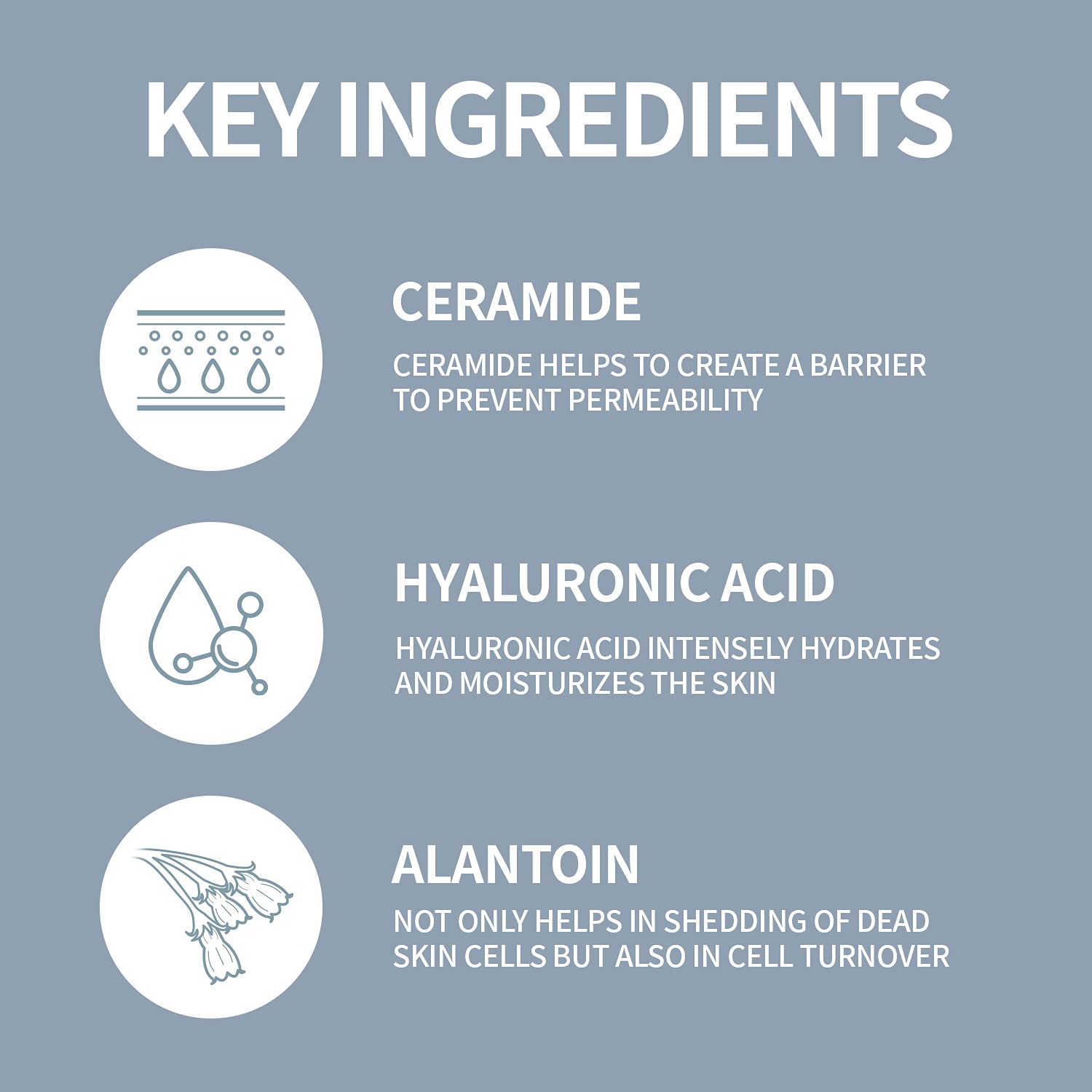 • سرامید: به حفظ آب روی پوست کمک می کند و سد پوستی را تقویت می کند و پوست های خشک و دهیدراته را نرم می کند.