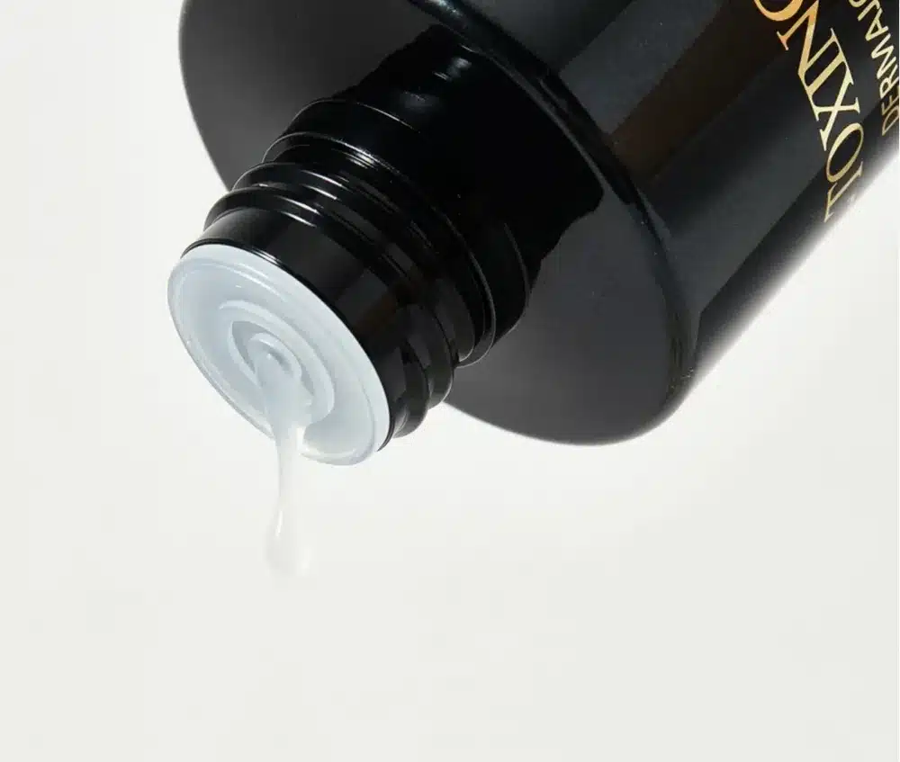 - پس از پاکسازی پوست، مقدار مناسبی از تونر جوانساز سل توکسینگ مدی پیل را روی پد پنبهای بریزید.