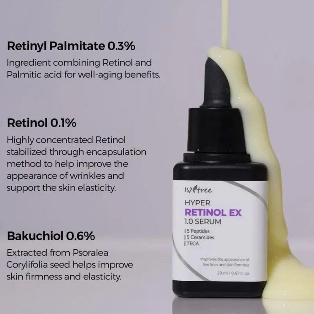 هایپر سرم رتینول 1% ایزنتری سرمی با قابلیت جوان کنندگی و ضد پیری با خواص رطوبت رسانی، تقویت کنندگی سد دفاعی و رطوبی، بهبود دهندگی ظاهر چین و چروک و خطوط ریز، استحکام بخشی و صاف کنندگی پوست صورت می باشد. سرم رتینول ISNTREE حاوی 1٪ رتینول، 0.3٪ رتینیل پالمیتات و 0.6٪ باکوچیول به همراه 5 نوع سرامید، 5 نوع پپتید و عصاره TECA با خواص تسکین دهندگی و ضد التهابی می باشد.